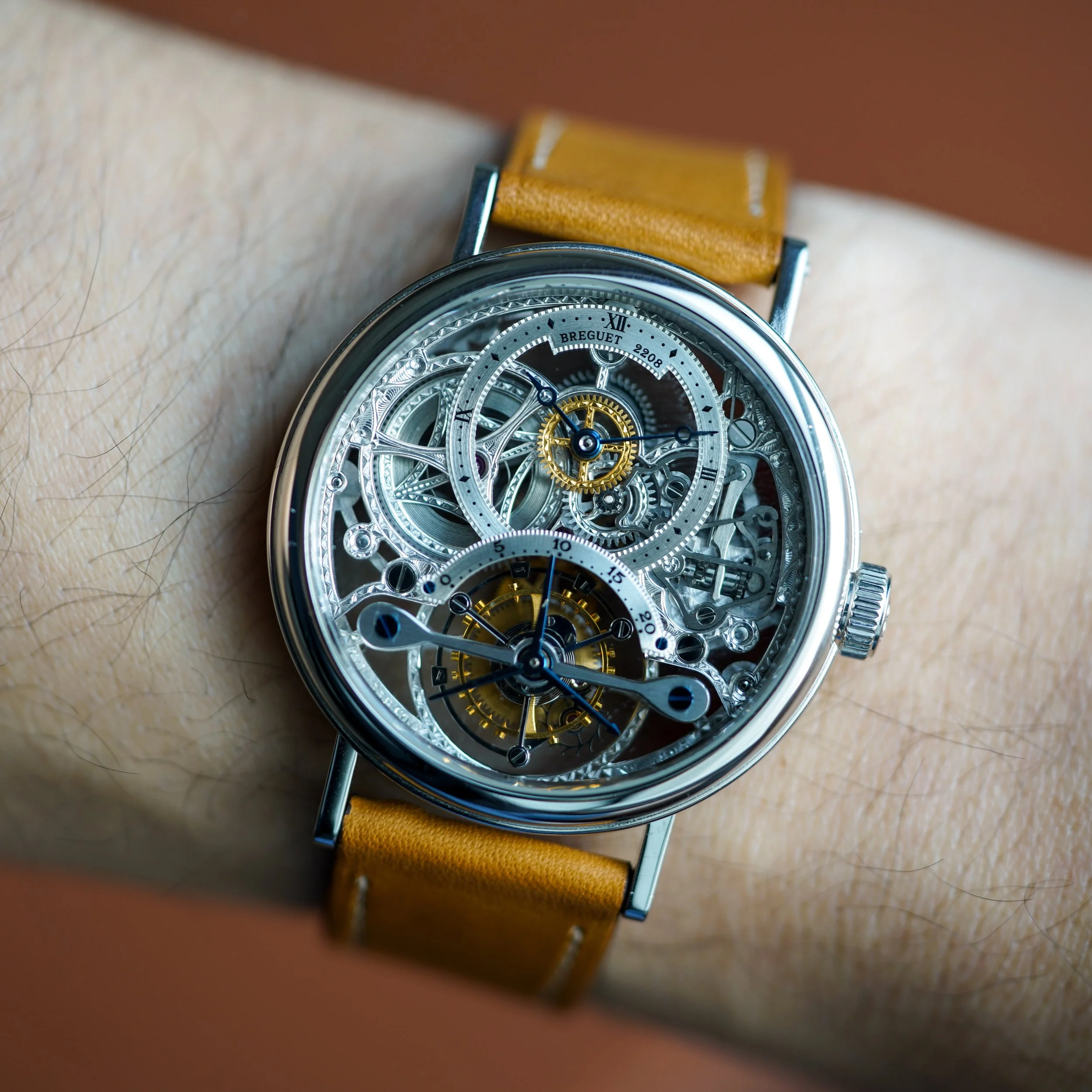나는 진심으로 다이얼이 시계에서 가장 중요한 부분이라고 생각한다. 네오 빈티지 브레게의 다이얼은 Galvanic Gilt 다이얼이나 Applied Indices 가 있는 투톤 다이얼을 모으는 빈티지수집가들조차 만족시킬만한 요소가 많다. 특히 기요셰와 브러시드 메탈릭 피니시의 조합이 만들어내는 투톤 효과는 빈티지 시대의 투톤 다이얼을 연상시킨다. 시각적으로 즐길 요소가 매우 많지만 신기하게도 과하지 않다.