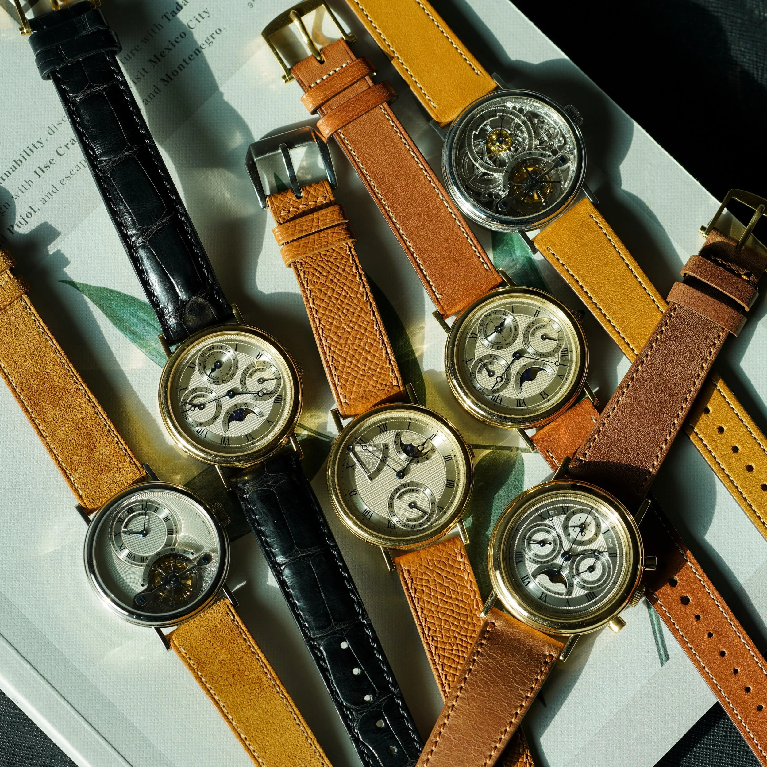 지난 수 년간 나는 거의 네오 빈티지나 현행 시계에 관심이 없었지만, 네오 빈티지 브레게는 그 매력에 더 일찍 빠지지 못한 것이 아쉬울 정도다. 브레게의 아름다움은 항상 염두에 두고 있었지만 1930~40년대에 지나치게 몰입해 있었기에 실제로 이 분야에 시간이나 자금을 투자하지 못했다. 다행스럽게도 지난 여름, 나는 나름의 브레게 캡슐 컬렉션을 구성할 수 있었다 - 이제는 아이콘이 되어버린 퍼페추얼 캘린더 ref. 3050 두 개(이탈리아어 다이얼 초기 개체와 독일어 다이얼 후기 개체), 르마니아 2310 기반 퍼페추얼 캘린더 크로노그래프 ref. 3617, 전설적인 브레게 No. 5 회중시계에서 영감을 받은 ref. 3130, 투르비용 ref. 3357, 그리고 스켈레톤 투르비용 ref. 3355. 이 시계들은 모두 훌륭한 착용감을 가지고 있고, 미적 균형이 좋다. 그리고 개인적으로 여전히 시장에서 저평가 되어 있다고 생각한다.