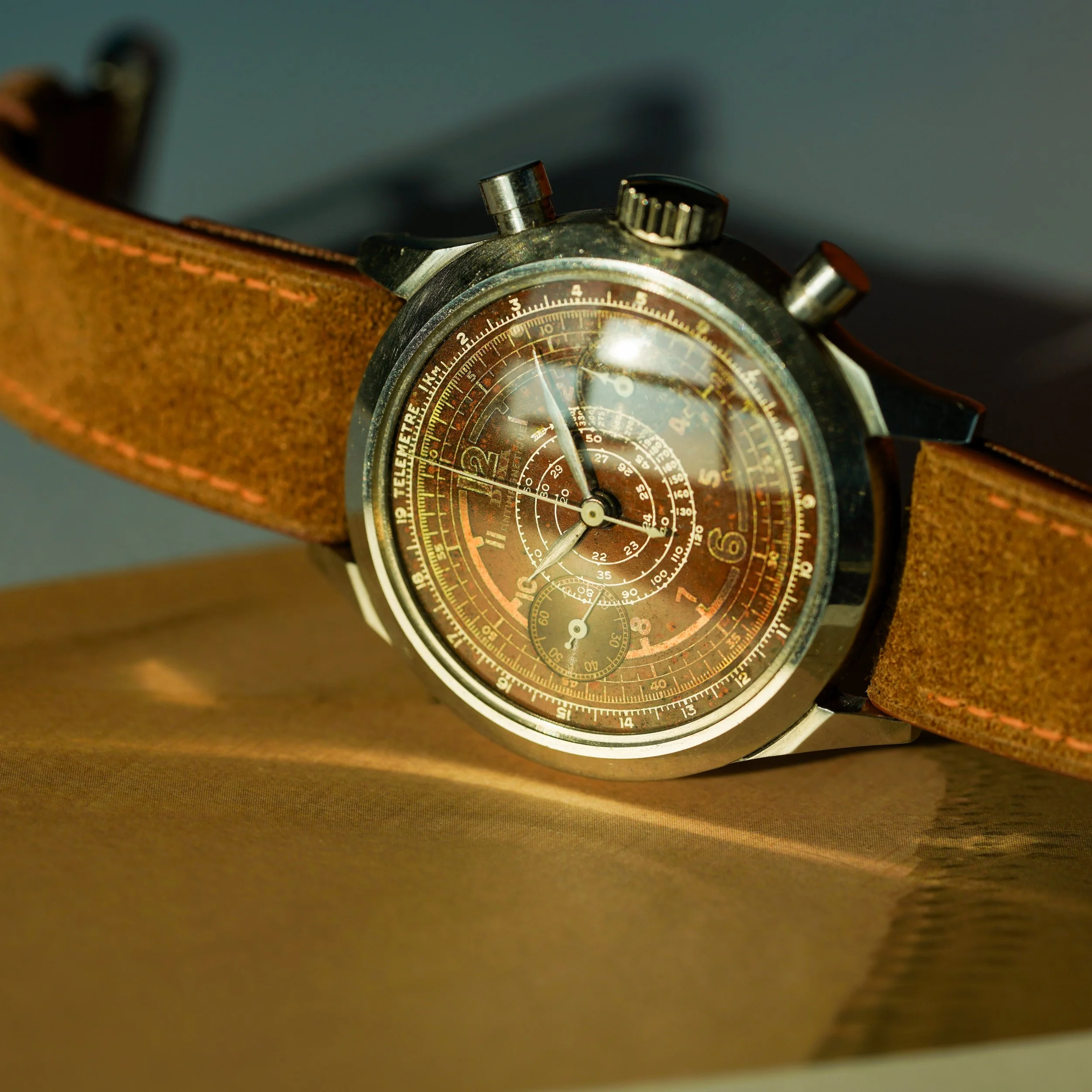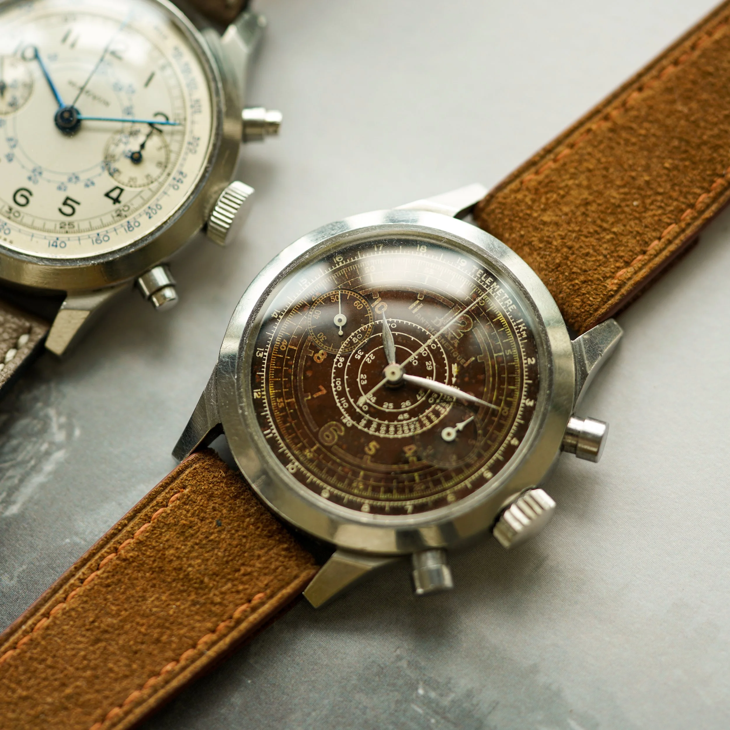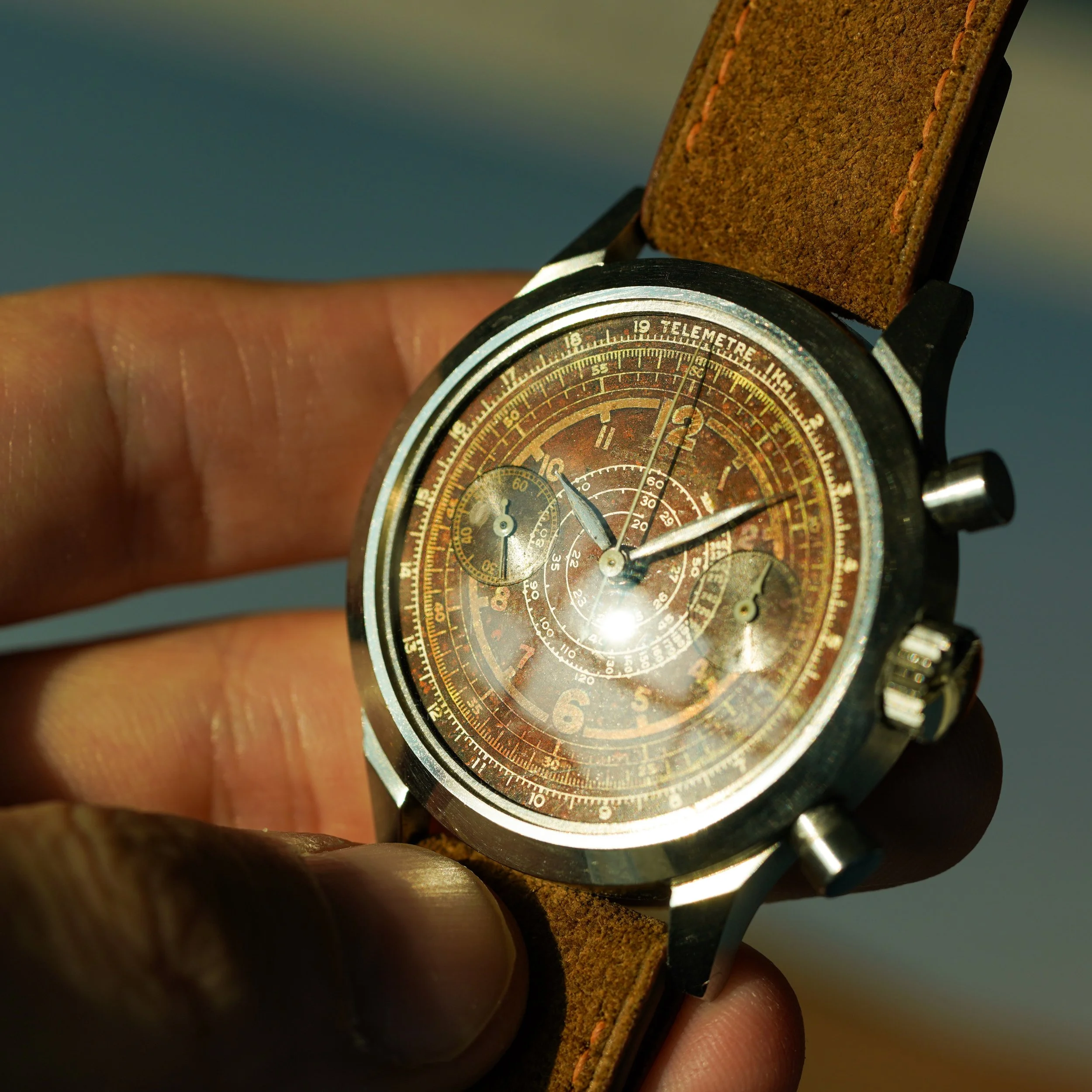 The sheer variety of dial layouts that were created for the Valjoux 22 caliber is incredible. There seems to be something for everyone, from the simplest dials with just Arabic numerals to those with the most intricate multi-scales and sector divisions. I may be biased, but would have to rank this Doxa dial among the very best, both in terms of rarity and quality. The even tropicalisation is the cherry on top, exemplifying the charm of collecting vintage - this dial layout is extremely rare, but this patina most certainly makes this particular dial unique.