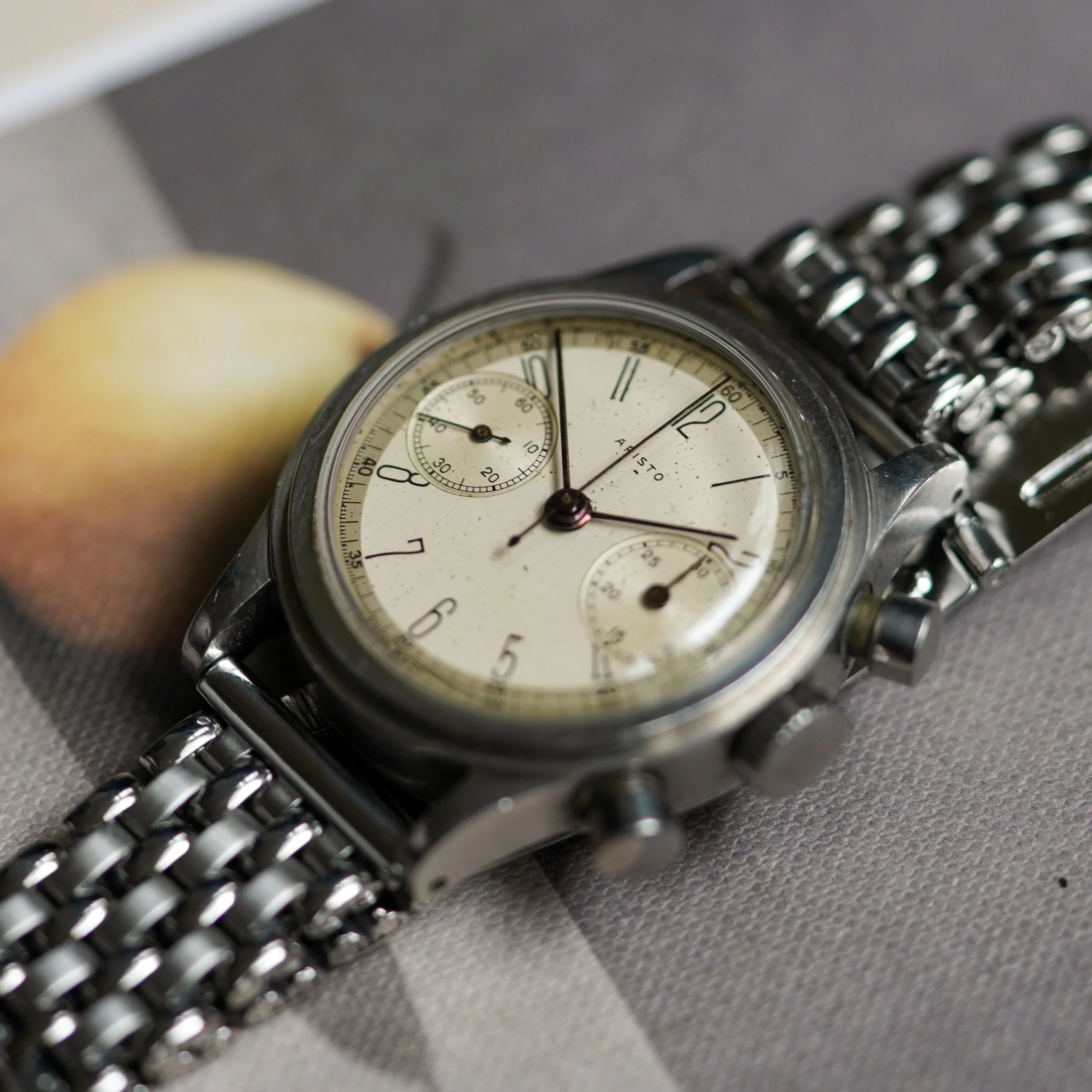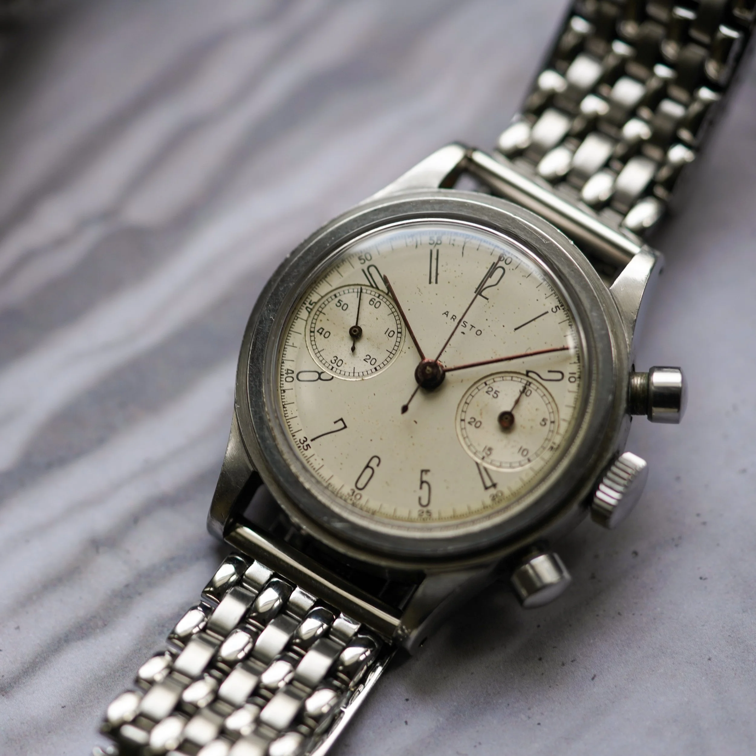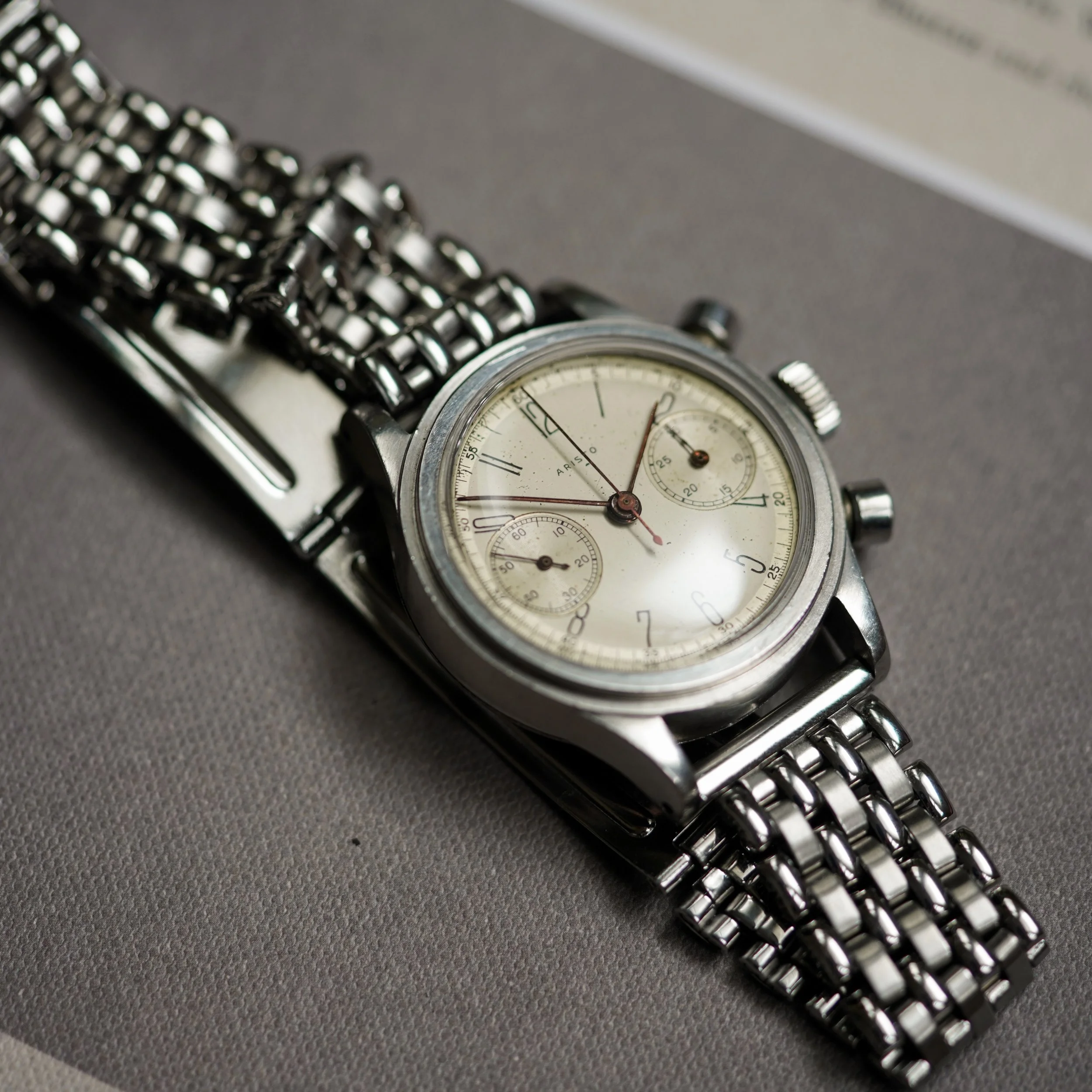 Case: Stainless steel, stepped-bezel, screw-back, oversized pump pushers, signed Aristo