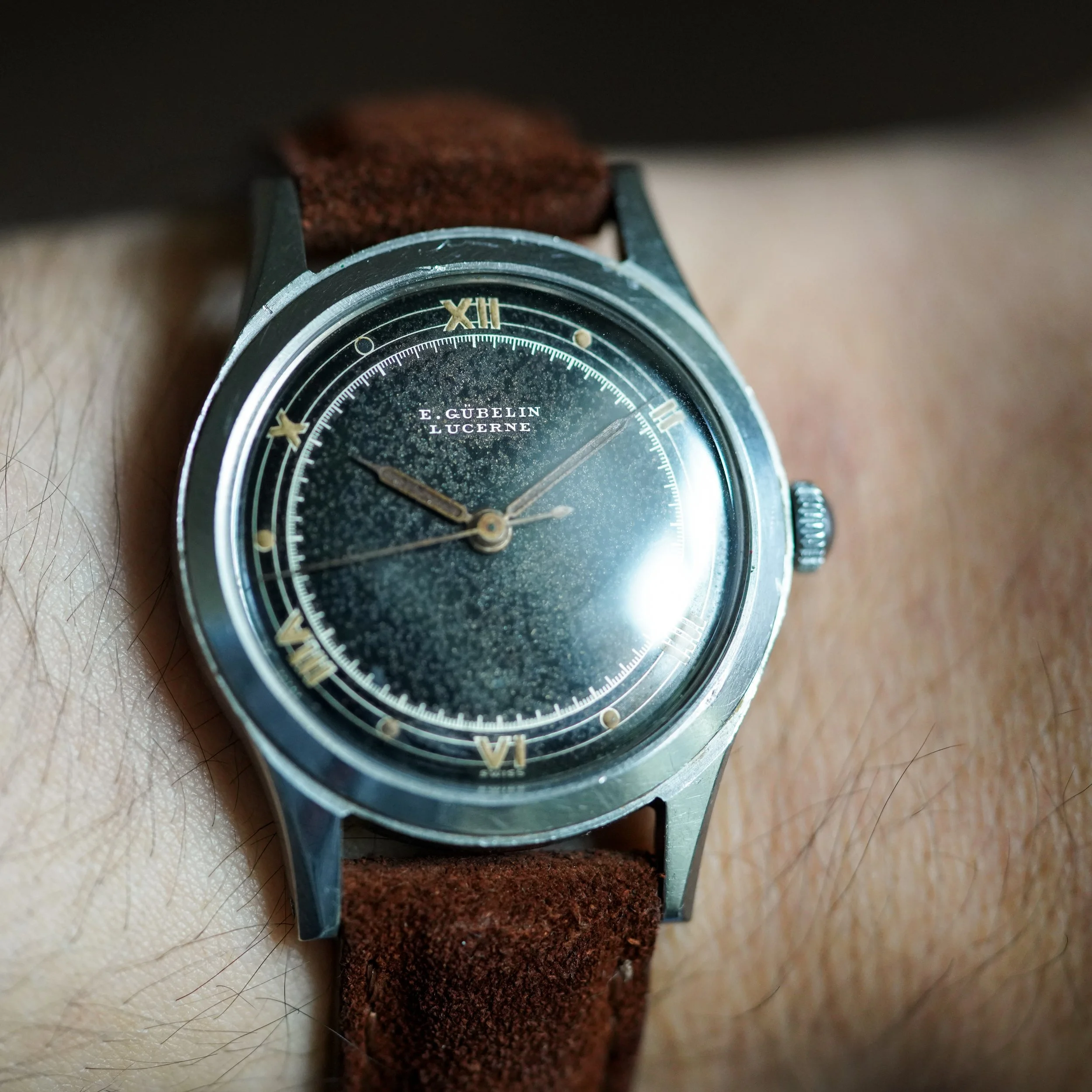 A rare Gubelin time-only with a perfectly even tropical black gilt dial featuring alternating dot and Roman numeral indices.