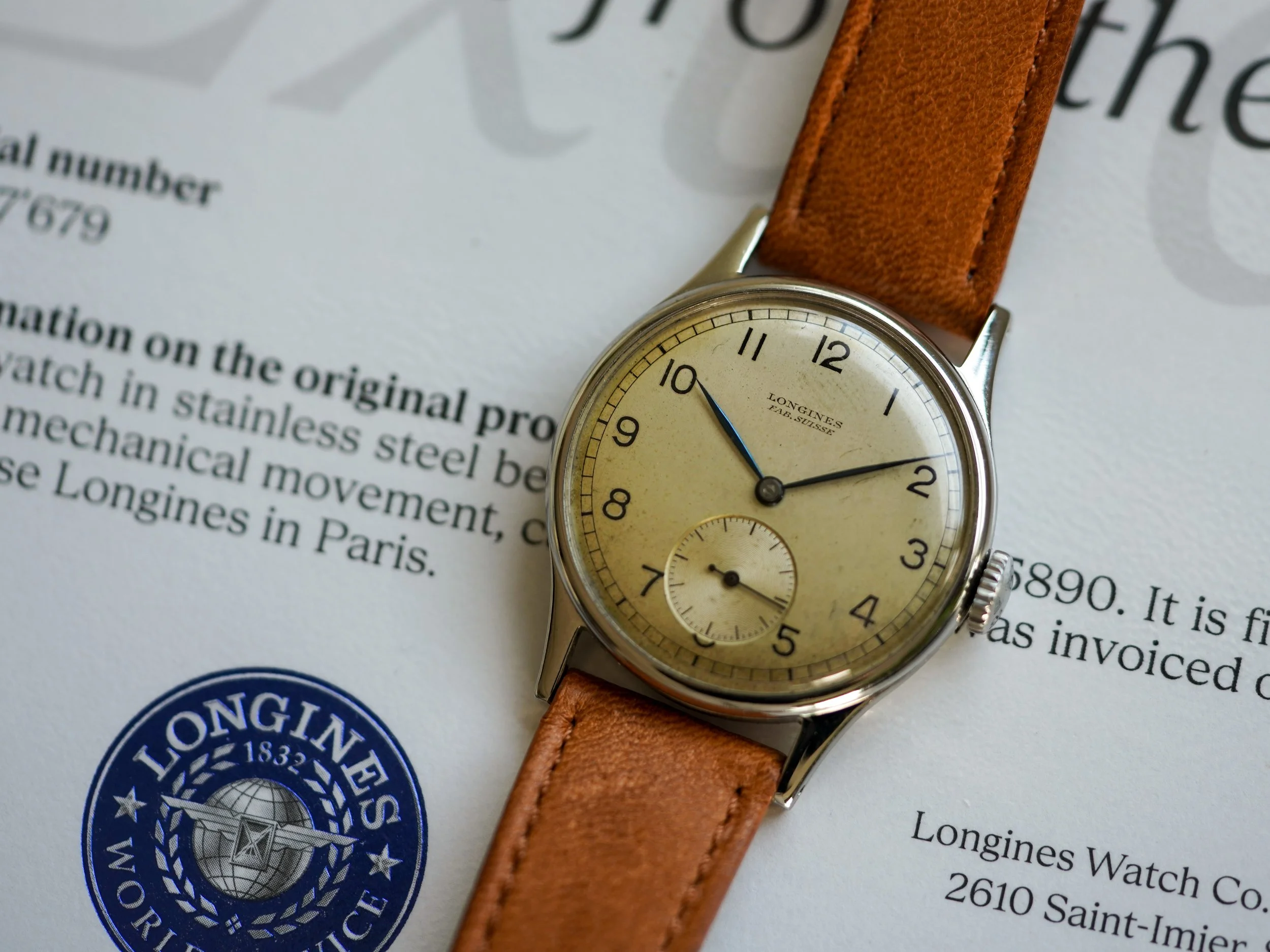 A very rare Longines ref. 5890 with a “Fab. Suisse” dial, confirmed on the Longines archives by its delivery to Paris, France.
