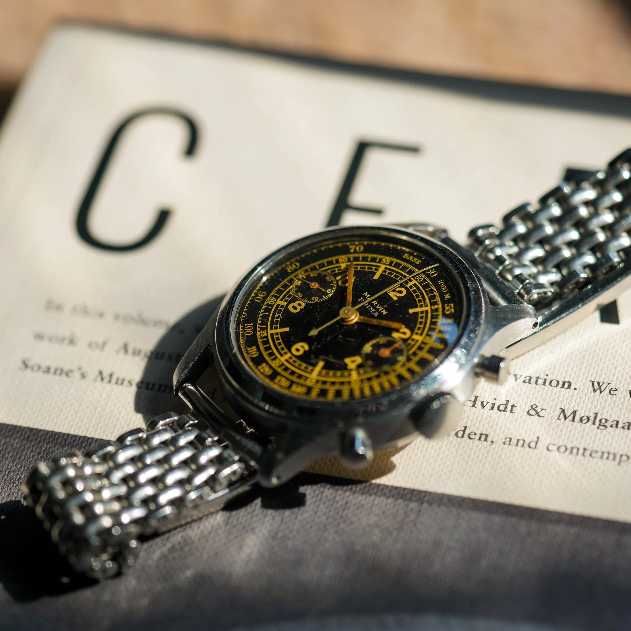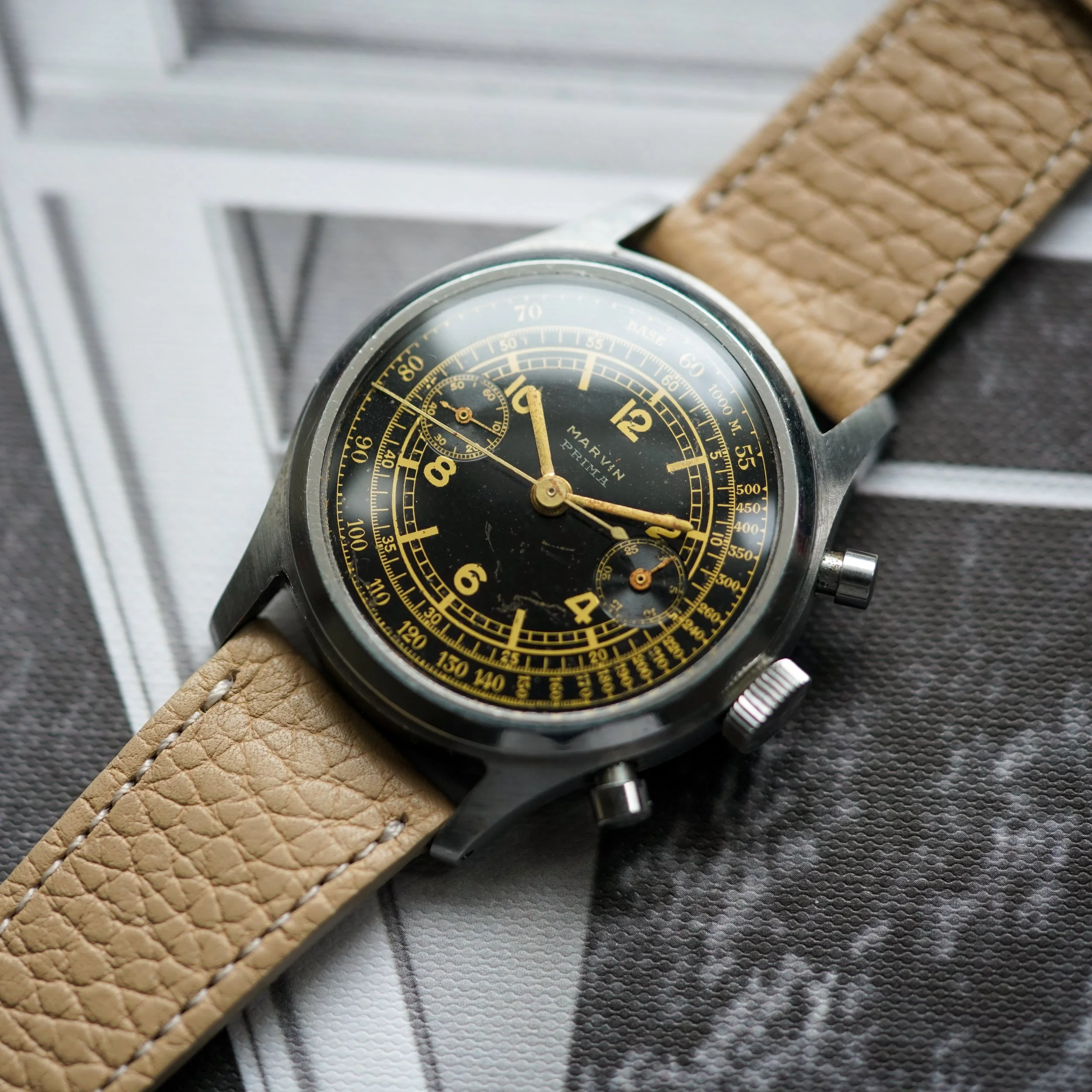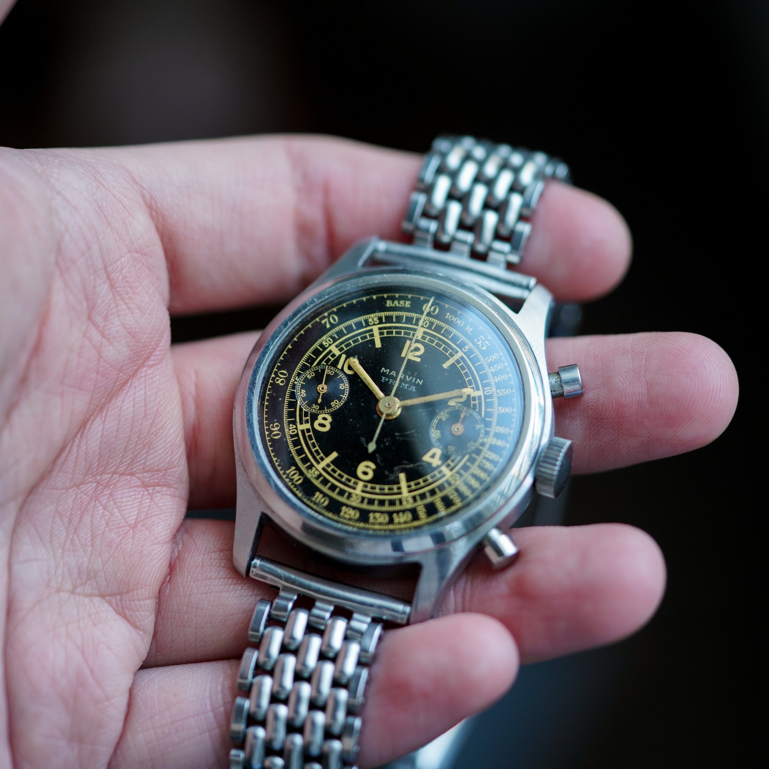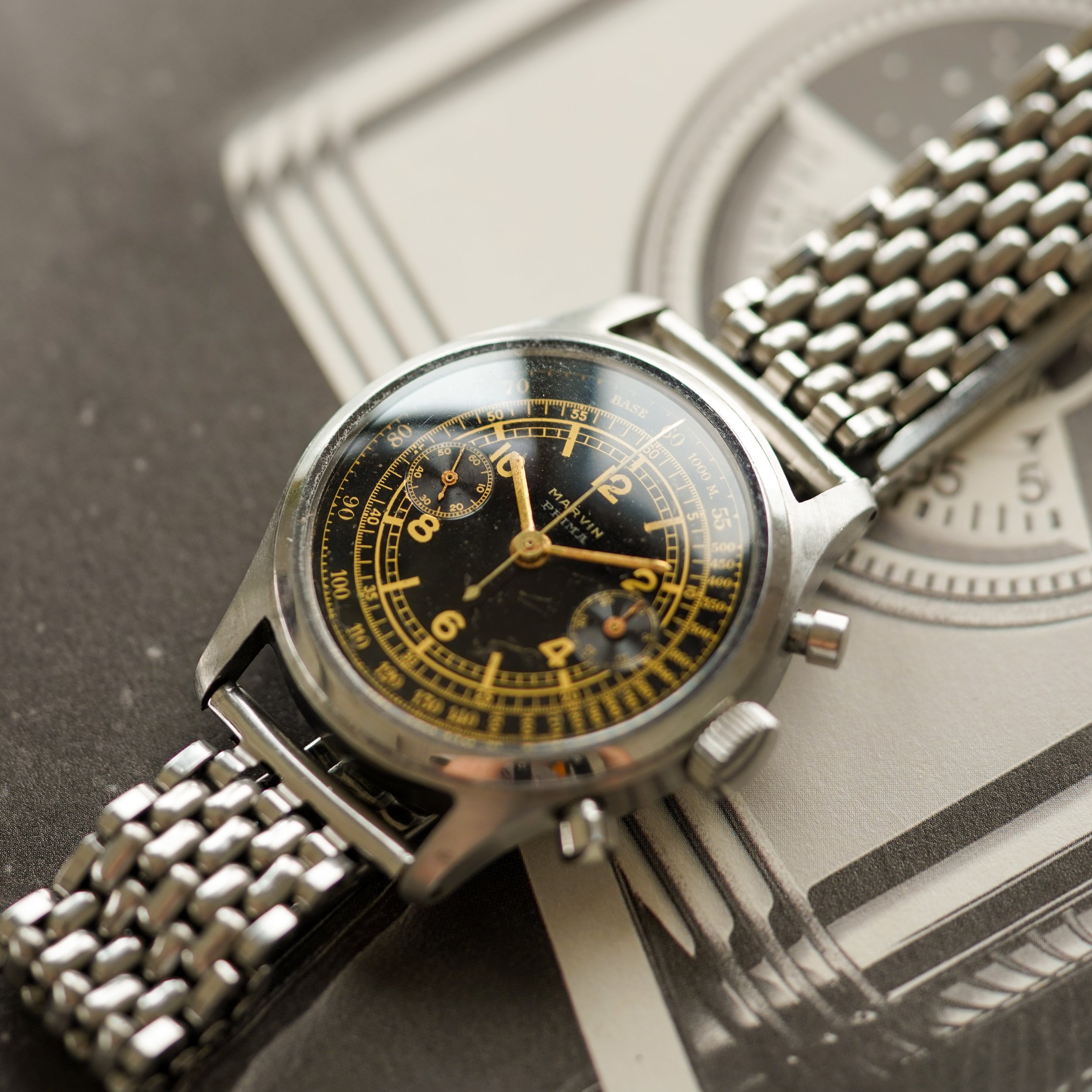 An extremely attractive waterproof chronograph by Marvin, featuring a strong stainless steel case and a glossy black gilt sector dial.