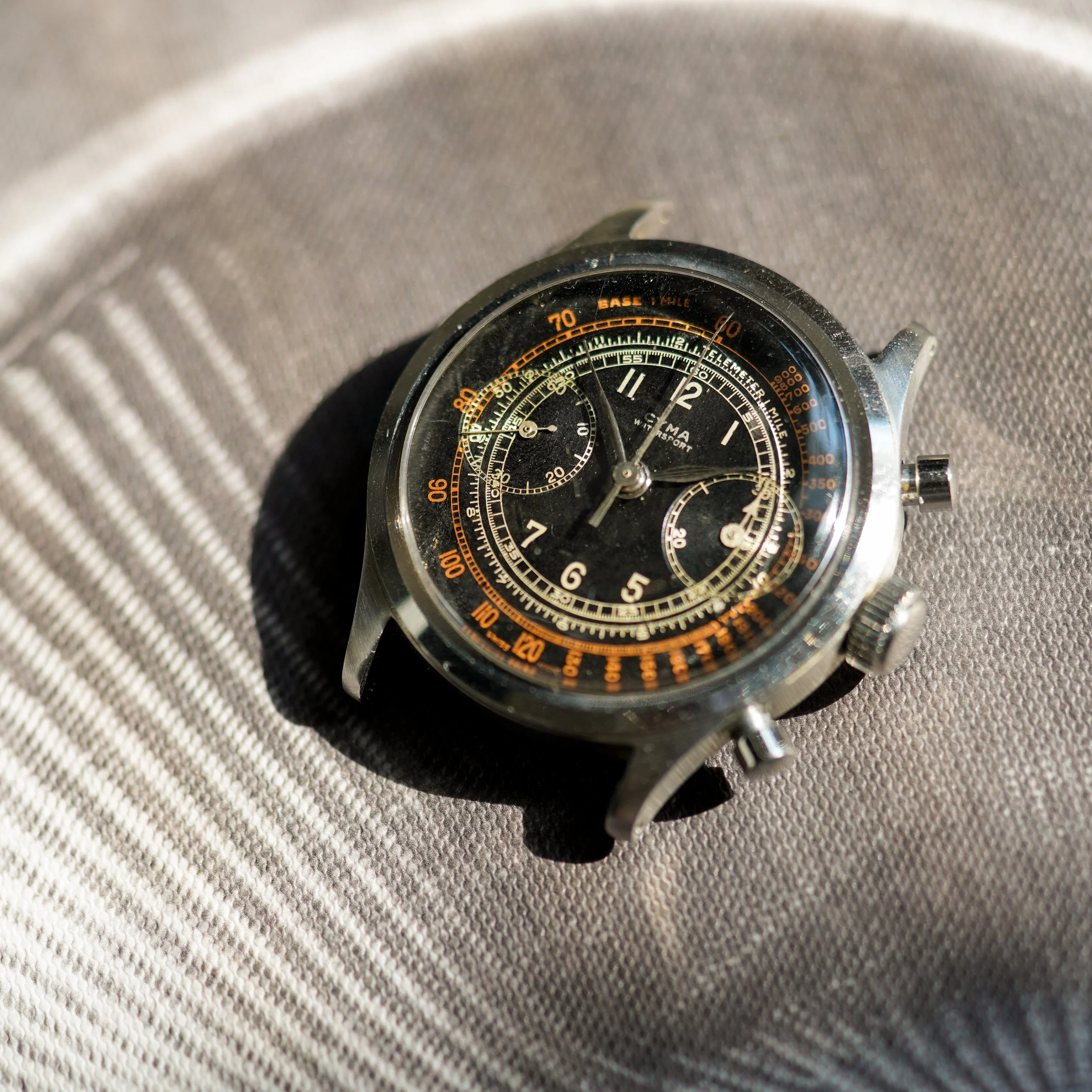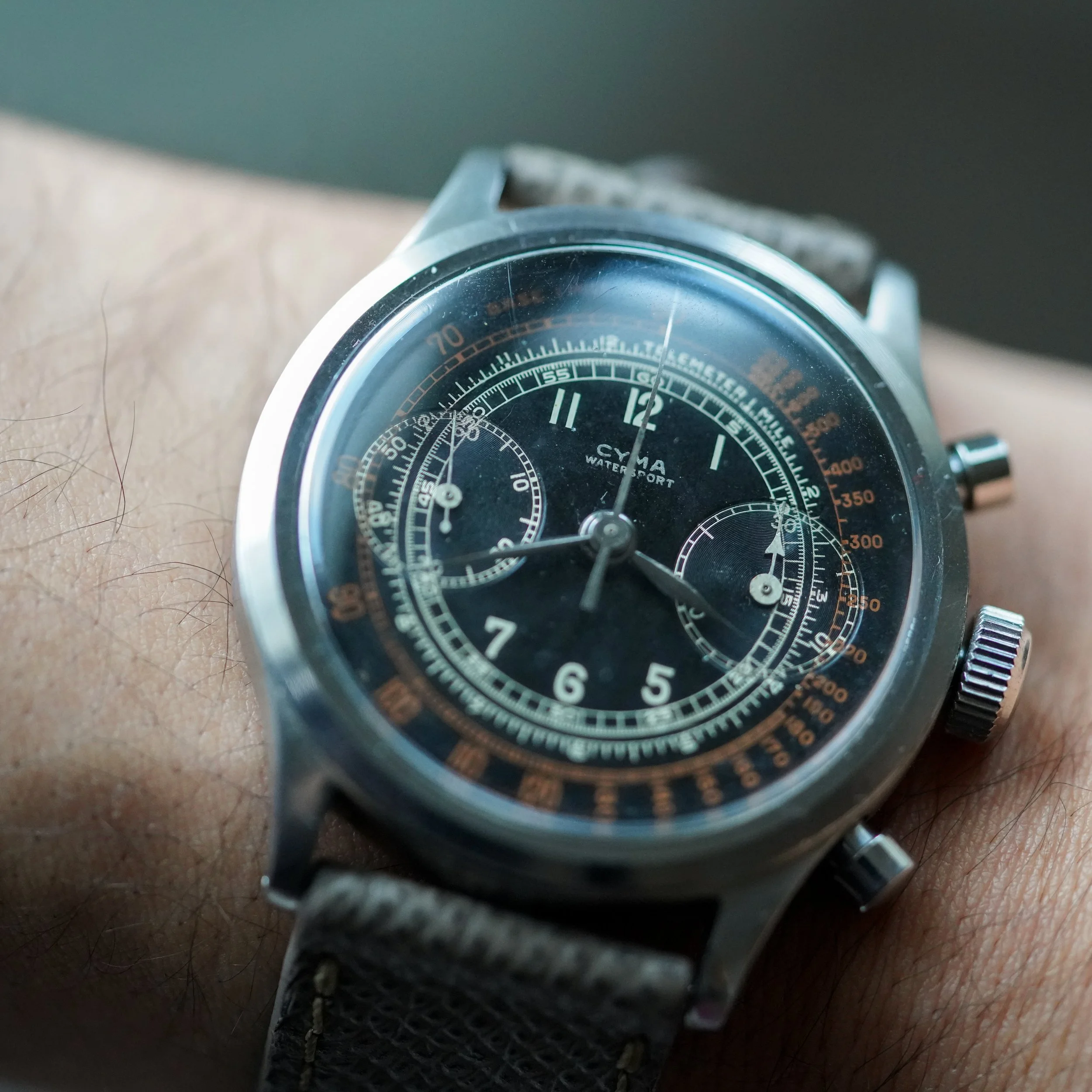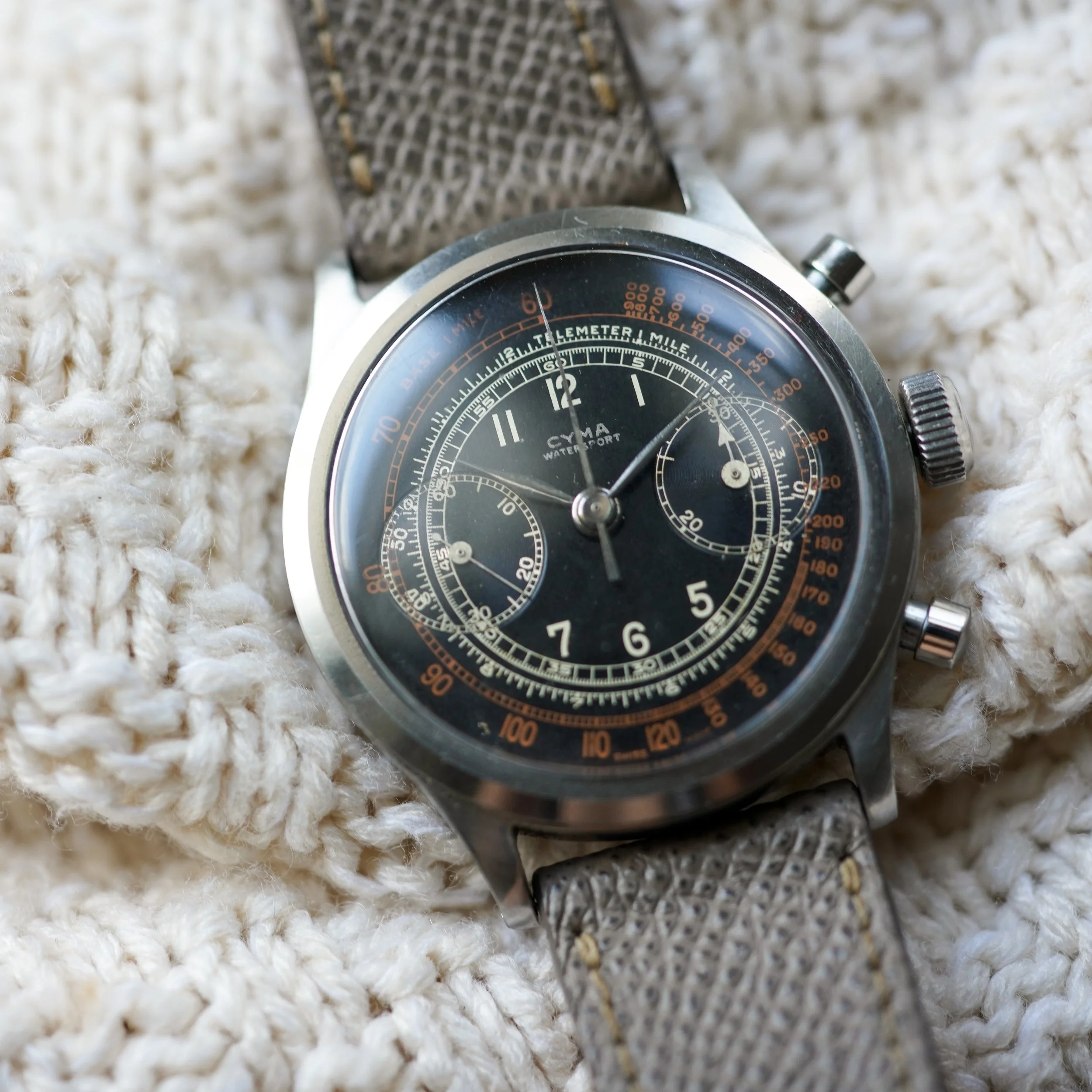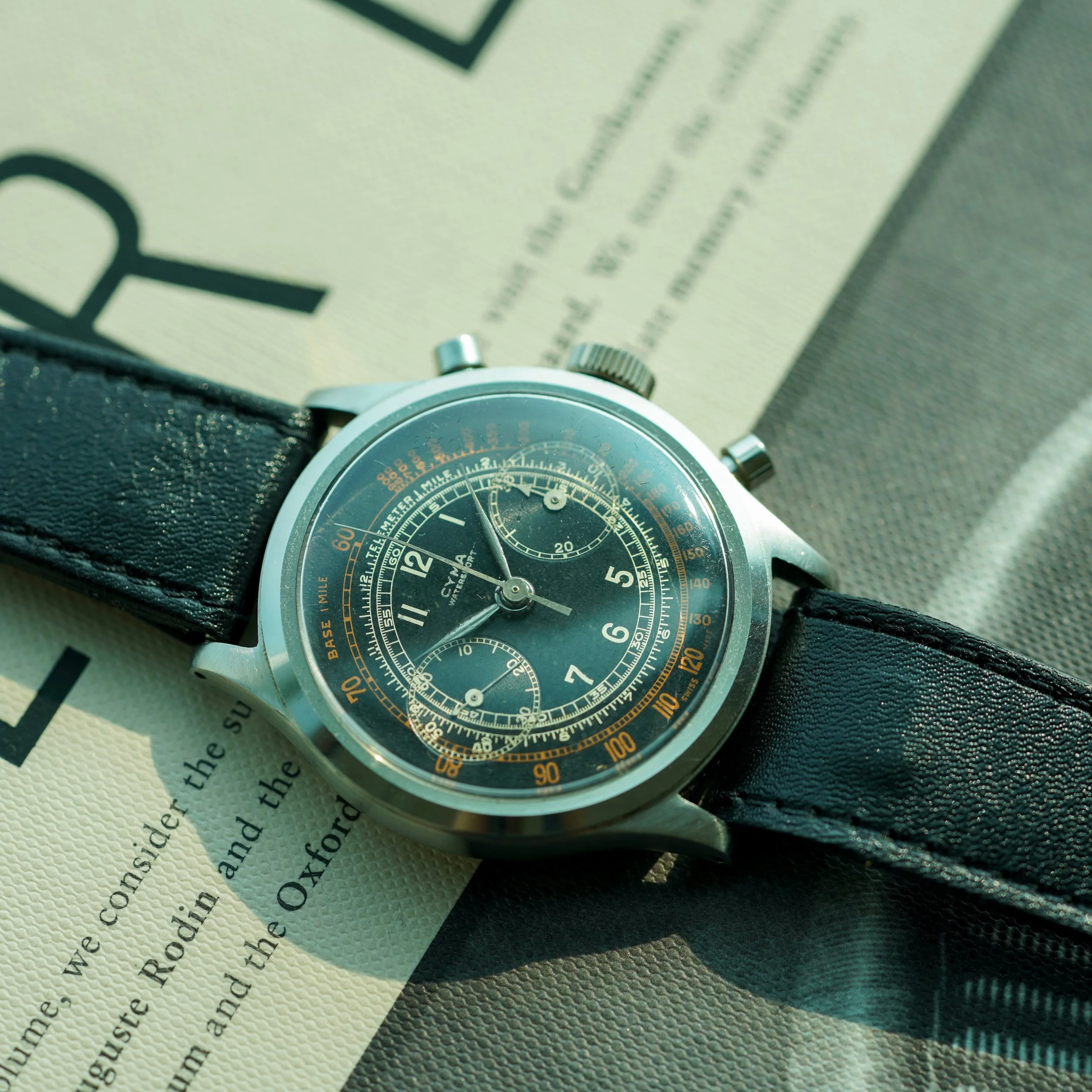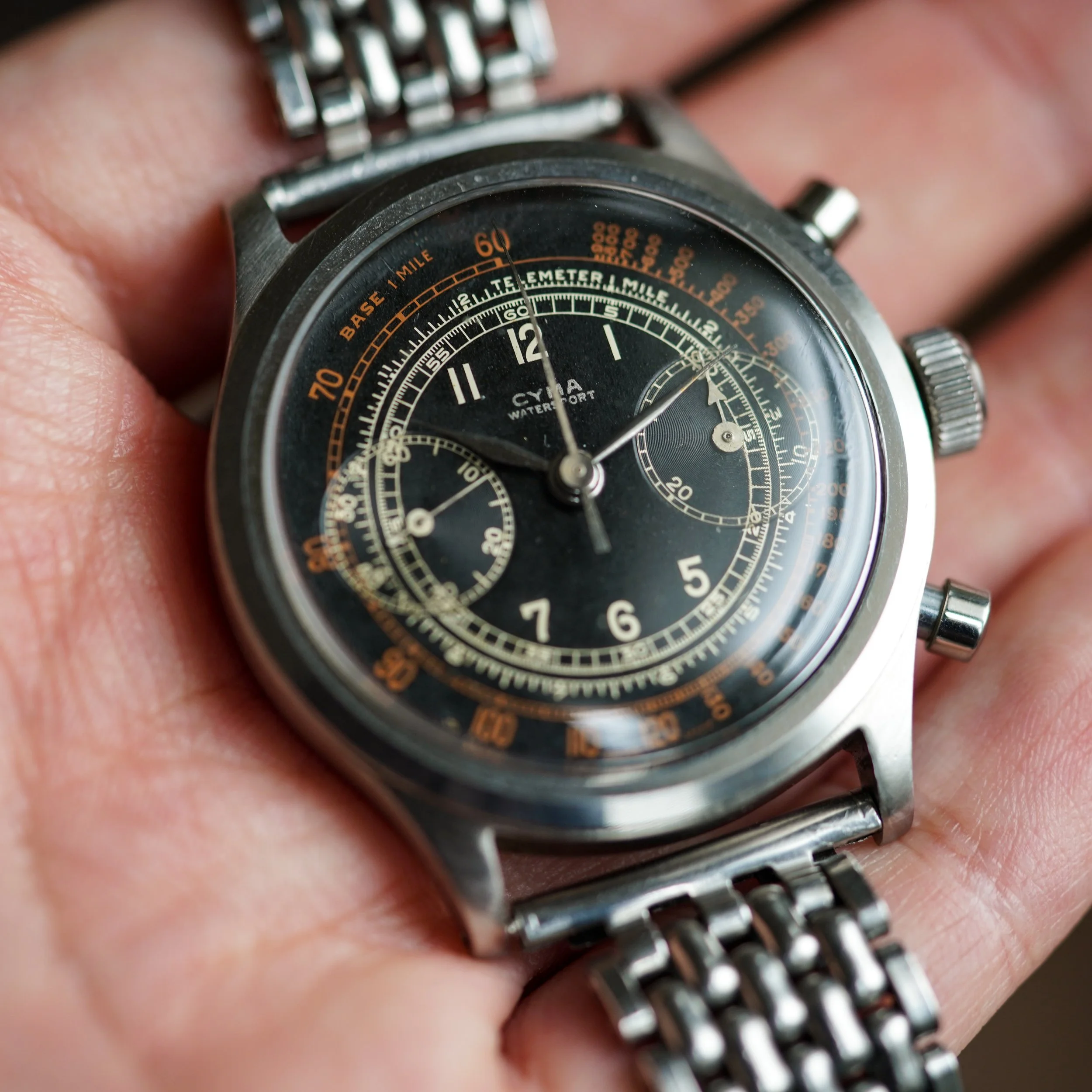 Movement: Manually wound chronograph Valjoux 22, signed Cyma