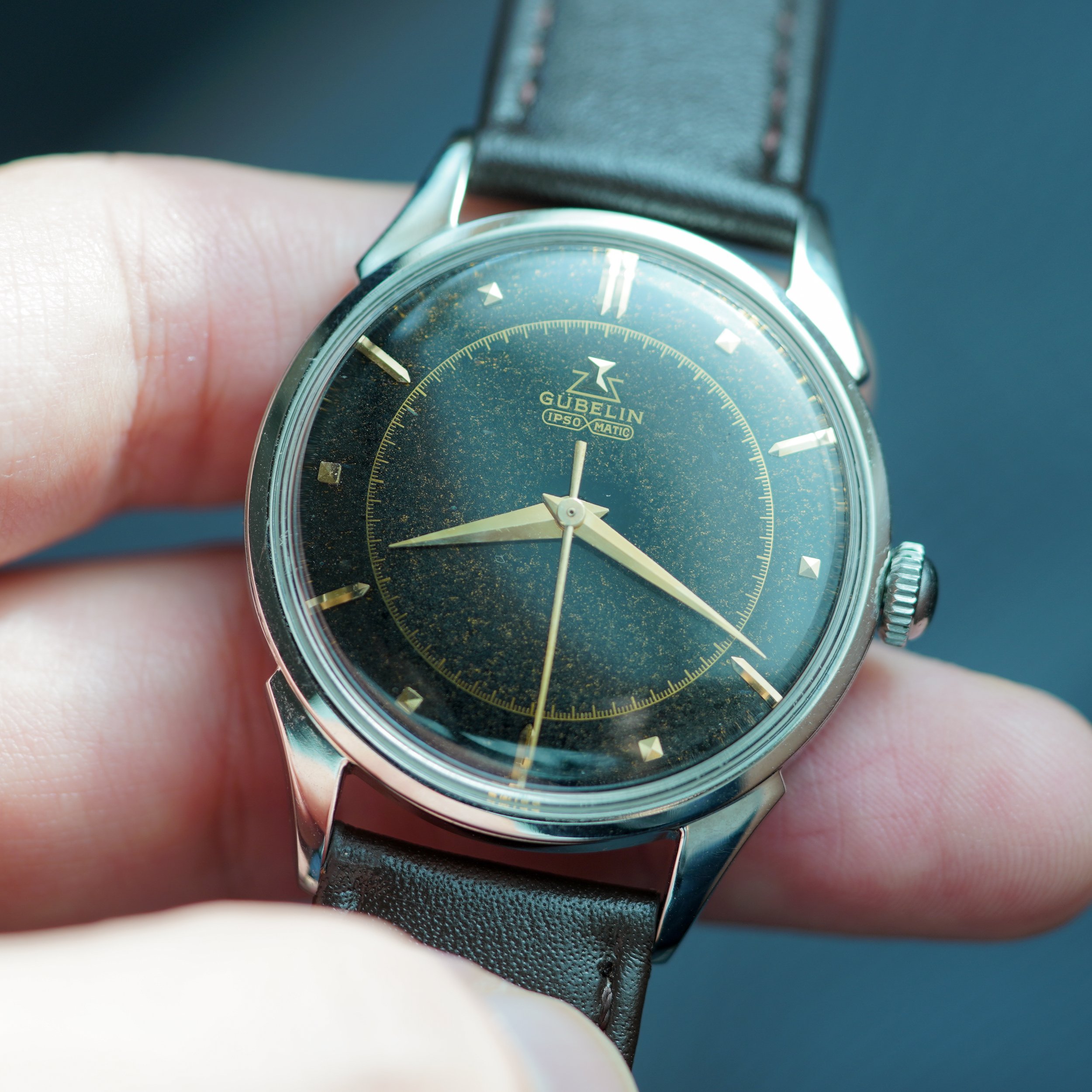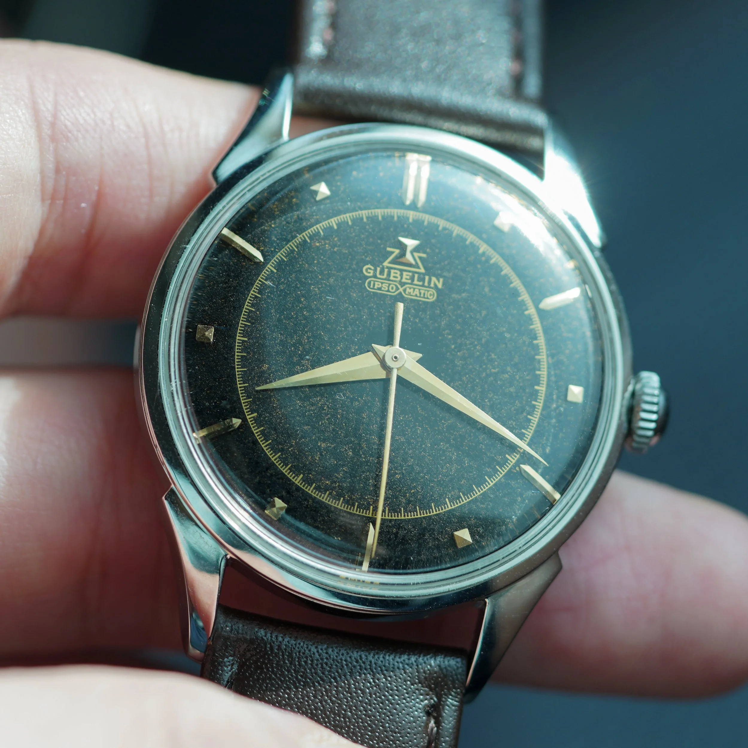 An incredibly rare Gubelin Ipsomatic with a perfectly even tropical gilt dial and sharp dauphine hands.