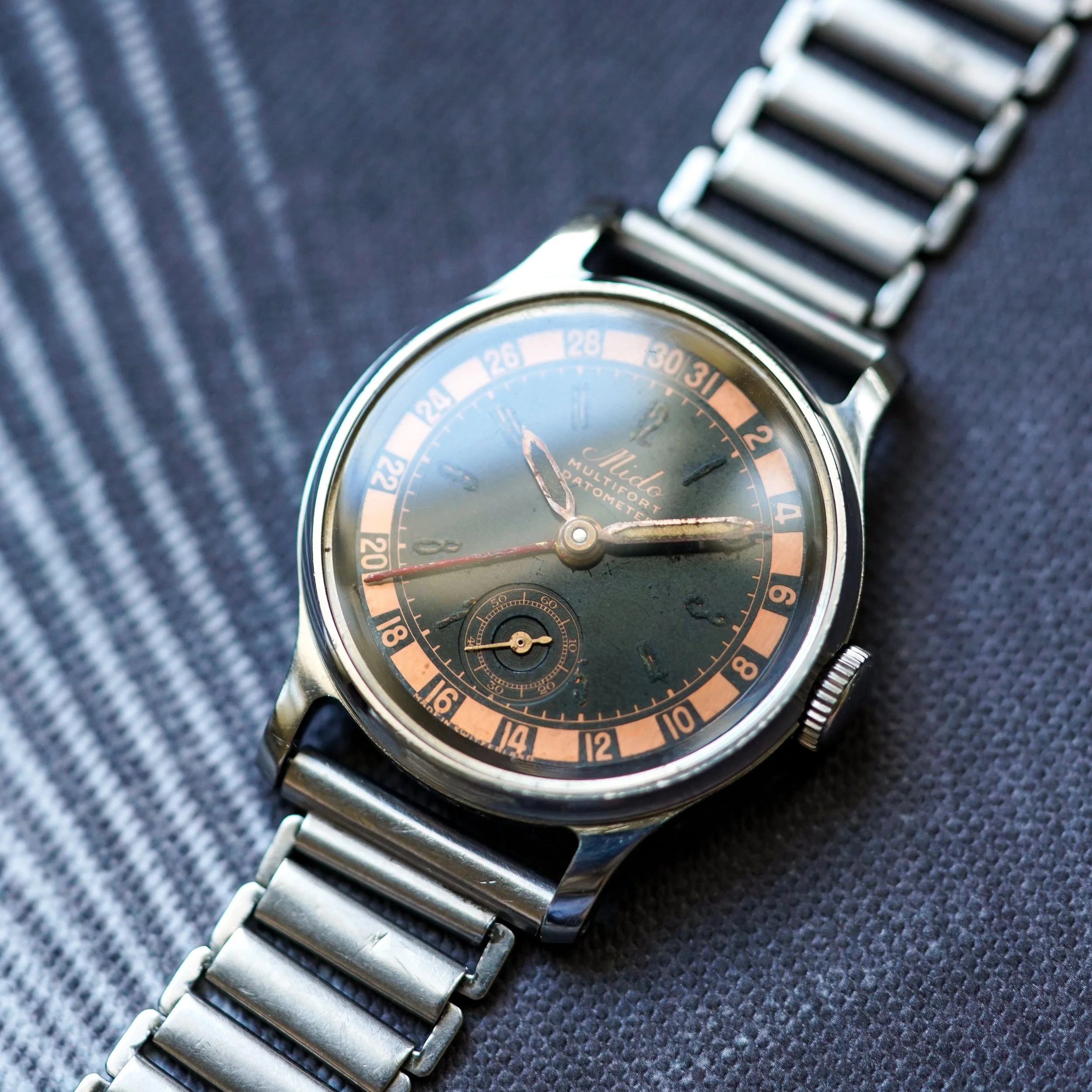 A stunning and rare specimen of Mido Multifort Datometer, with roulette gilt dial.