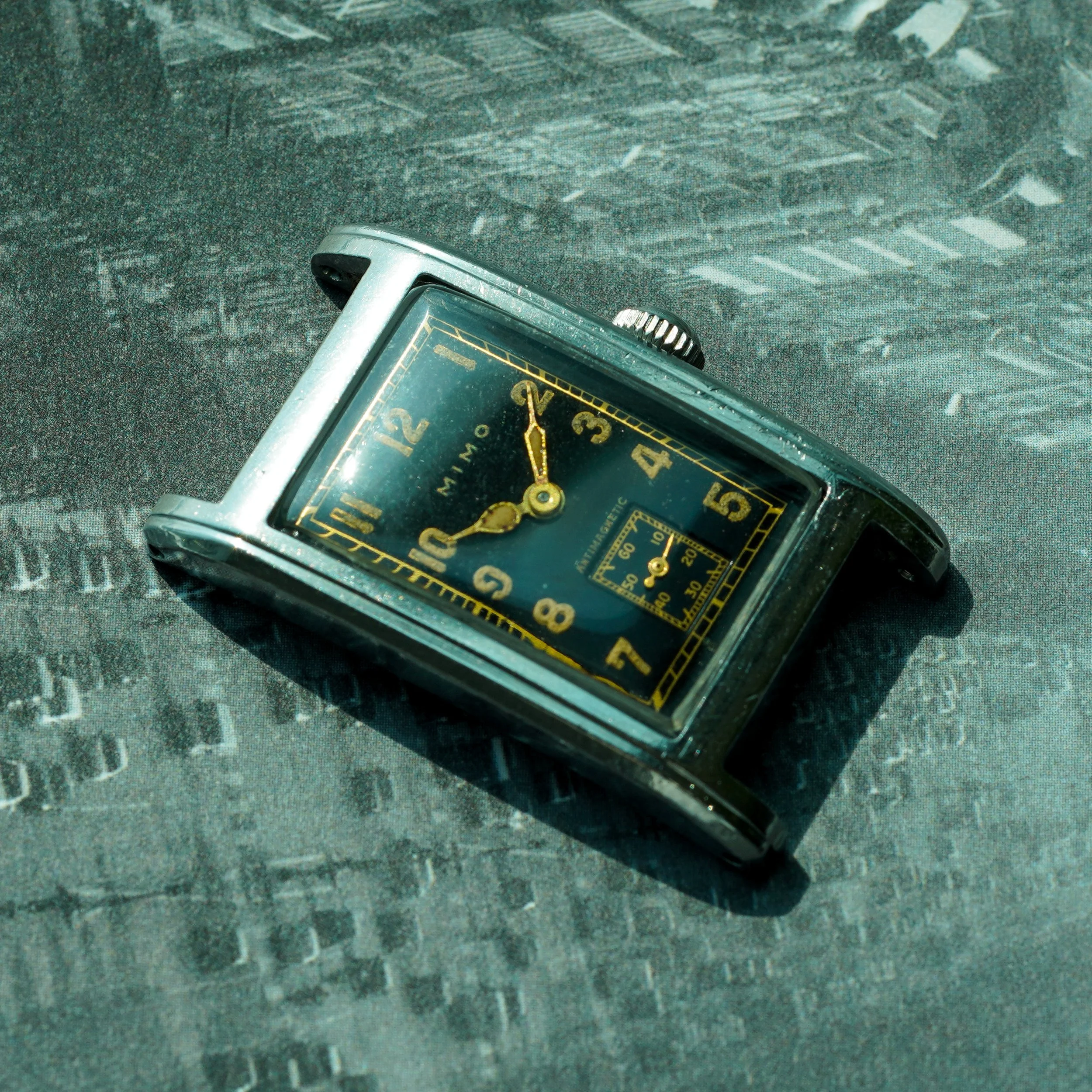 A very fine clamshell tank from Mimo (Girard Perregaux) in stainless steel, featuring a lovely glossy gilt dial.