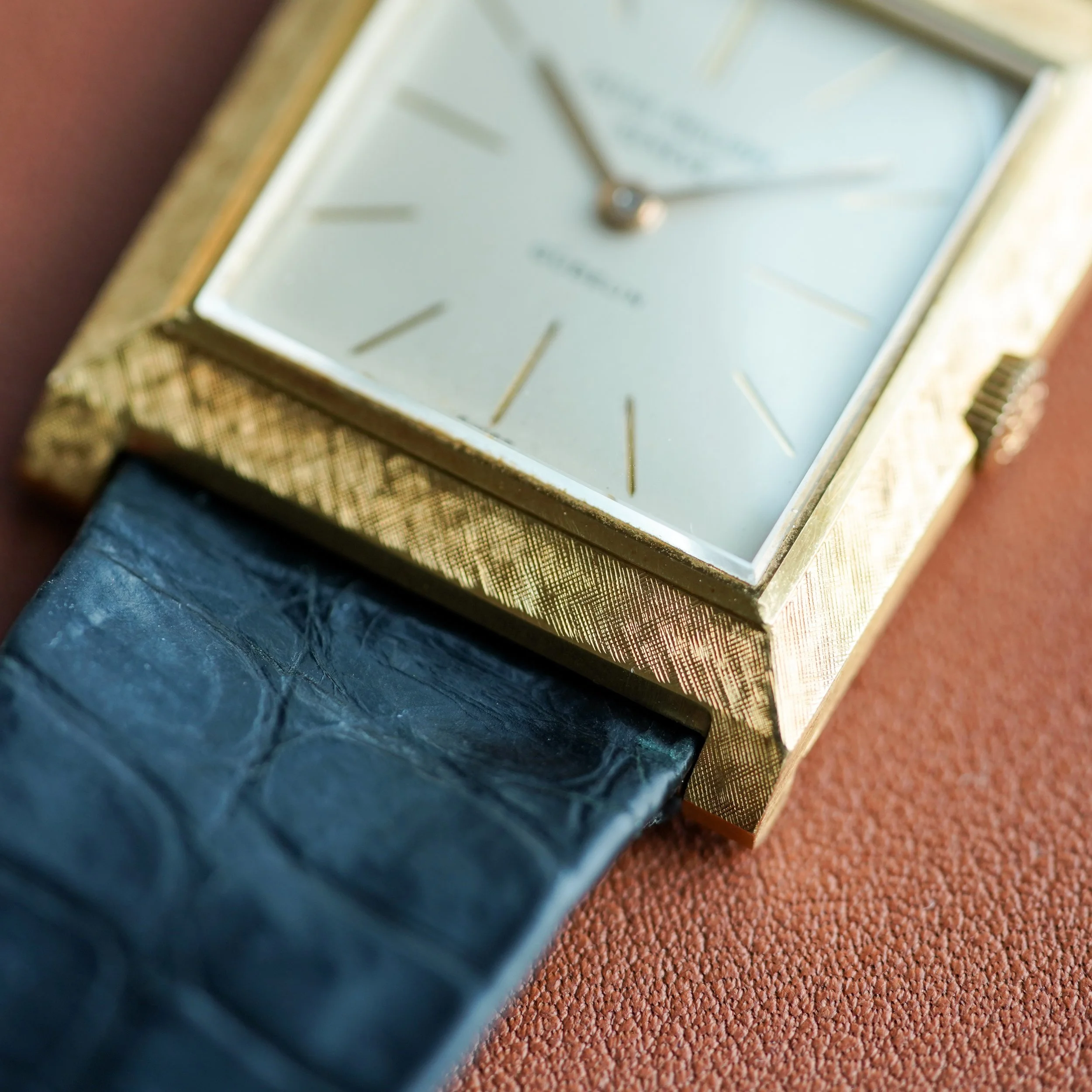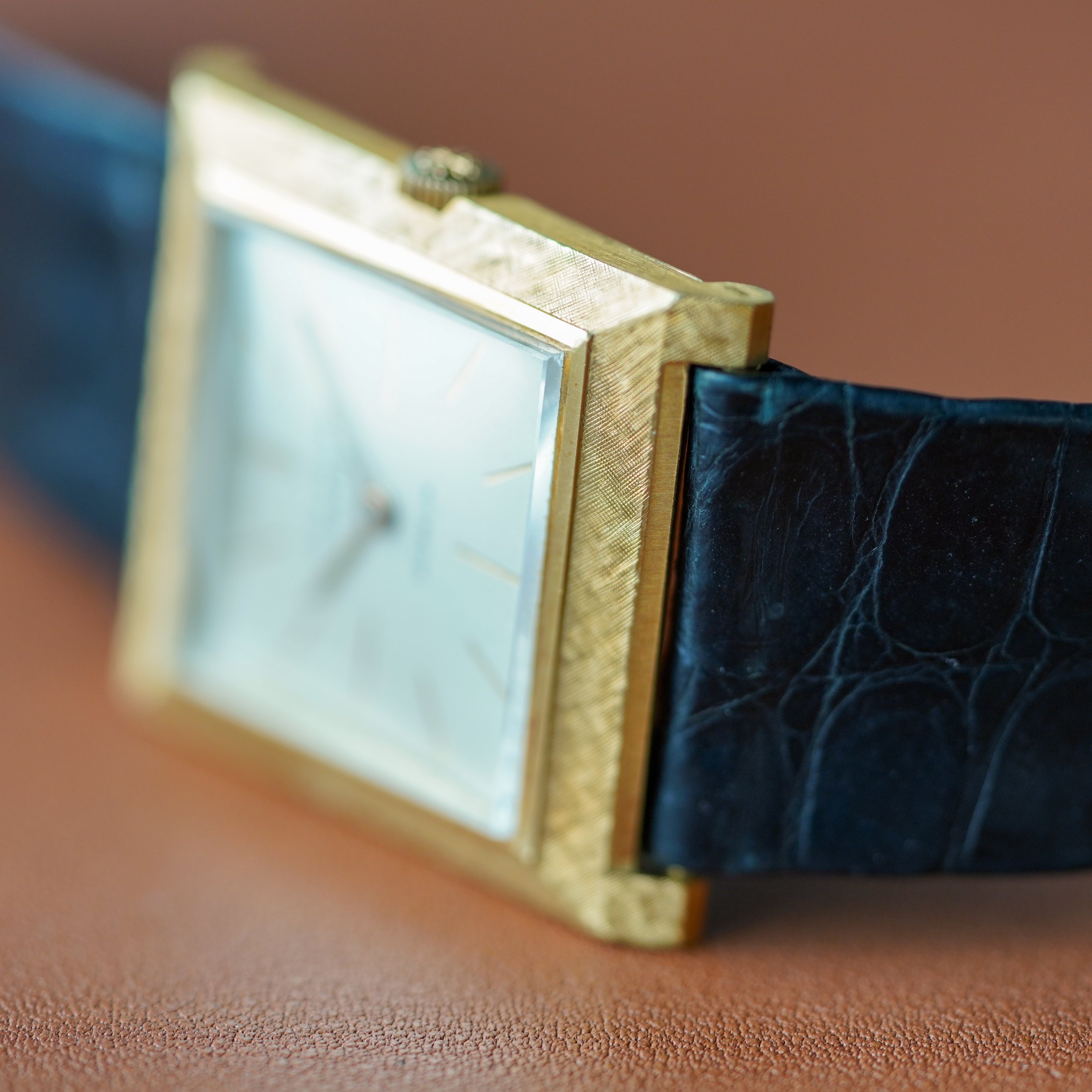 An incredibly well preserved Patek Philippe ref. 3404/3, retailed by Gubelin. The rare and nearly excessive Florentine finish on the case is extremely well preserved, and the watch still maintains its original strap and buckle.