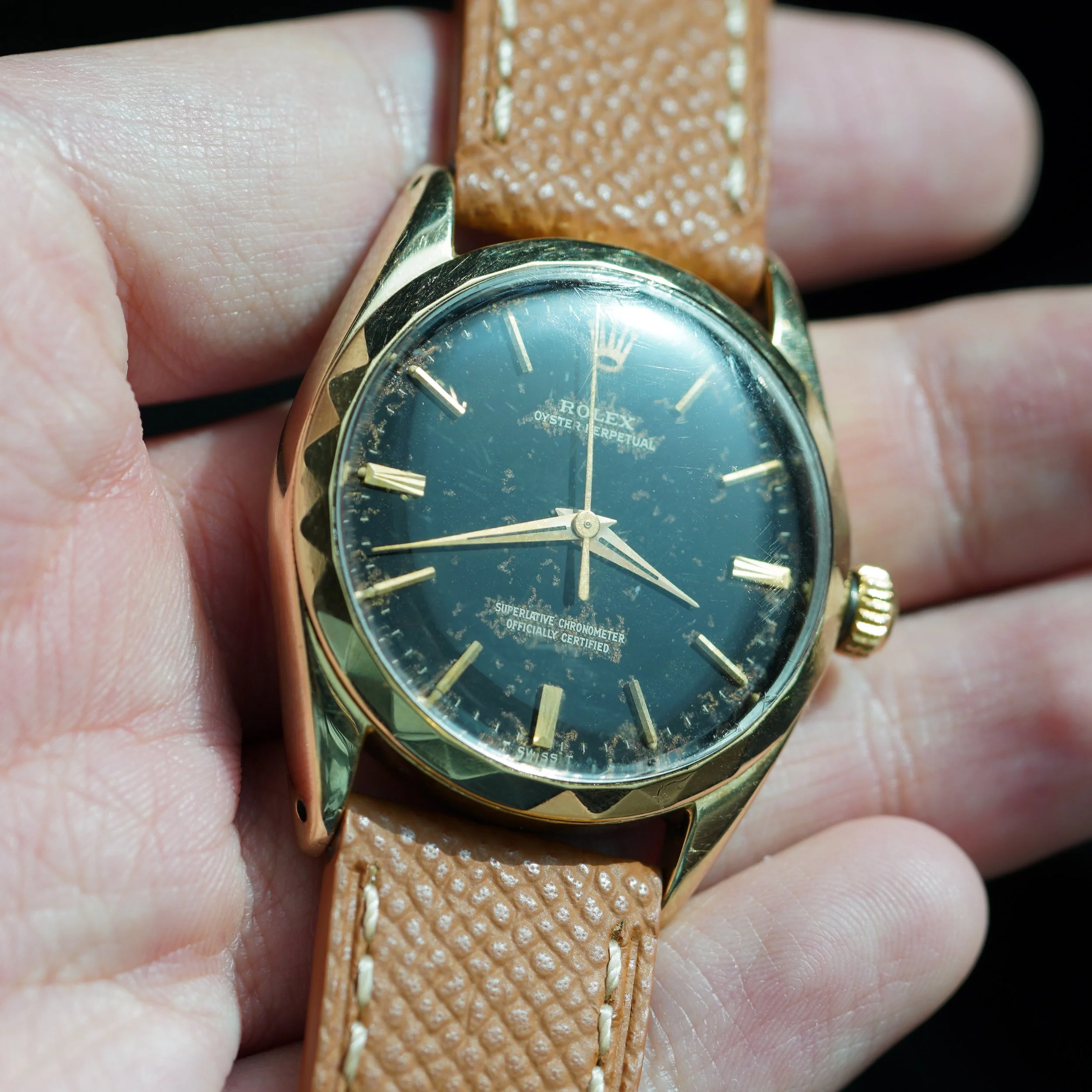 An incredibly rare Rolex oyster perpetual with a crazy zig-zag bezel and a glossy galvanic gilt dial.