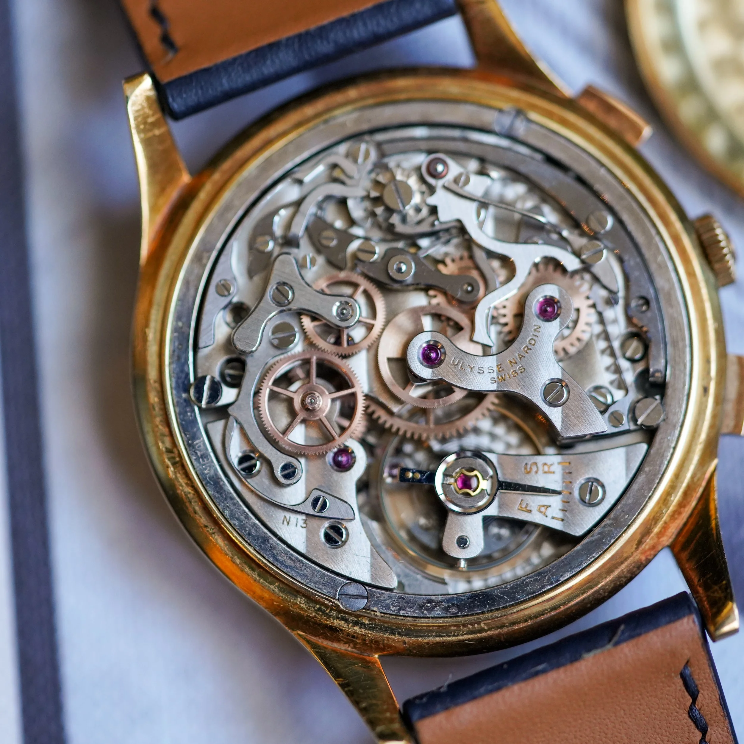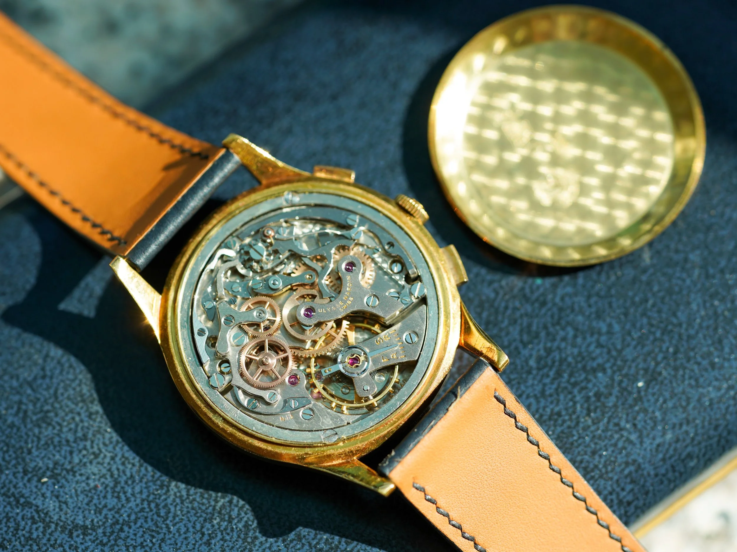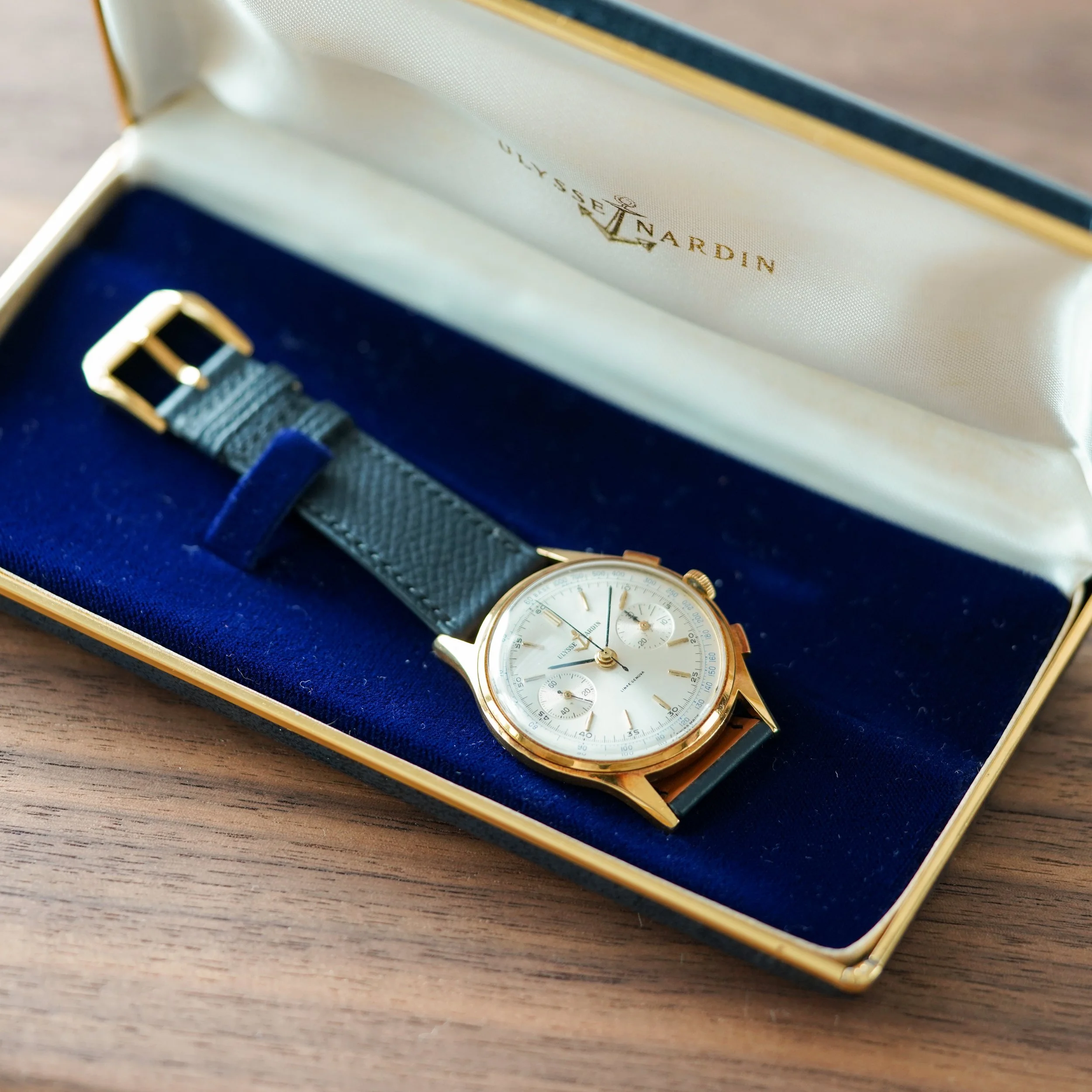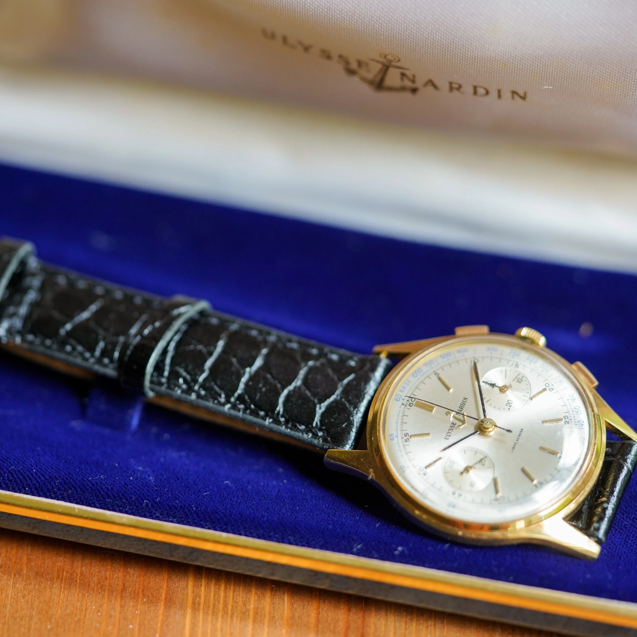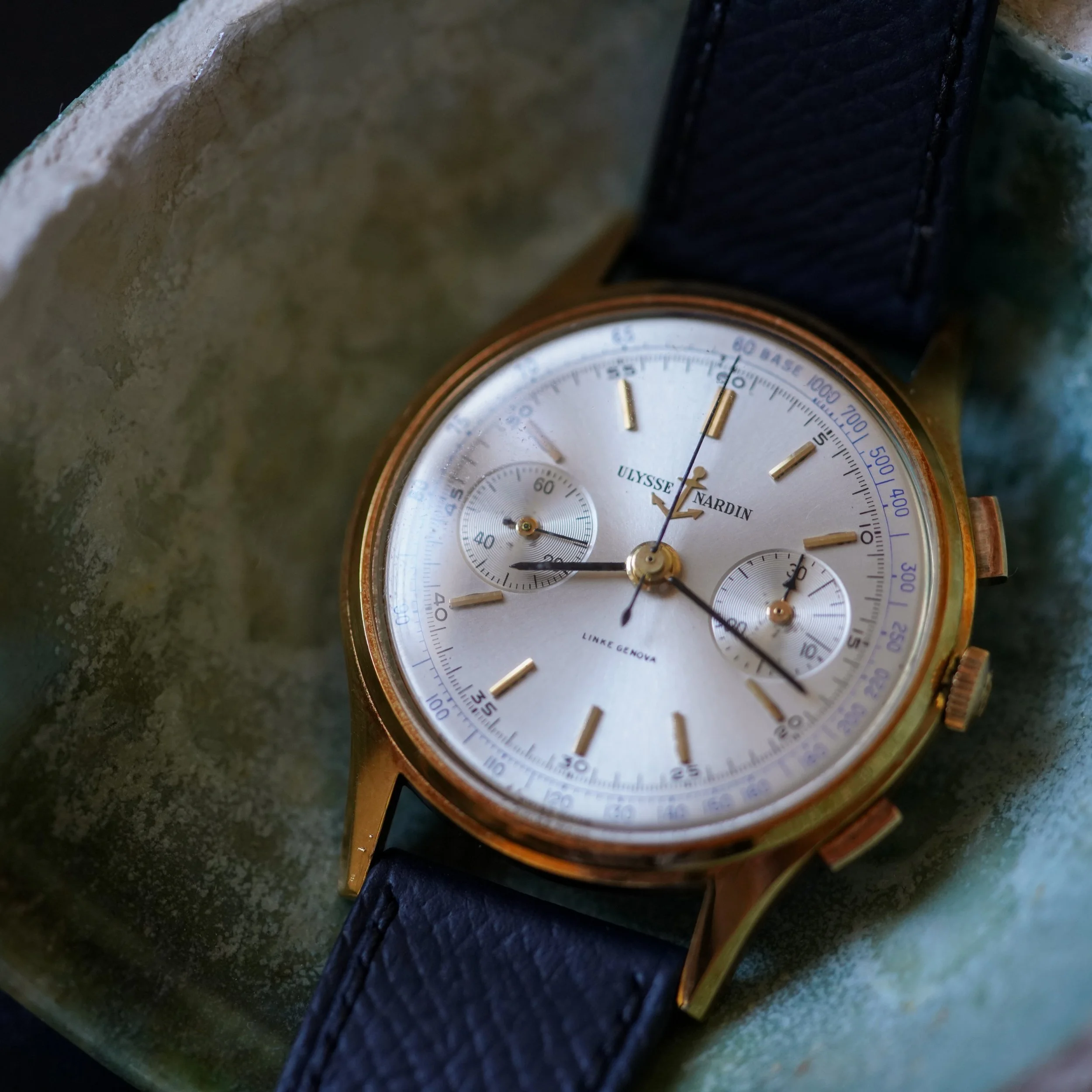 An oversized gold chronograph from Ulysse Nardin, retailed by Linke Genova.