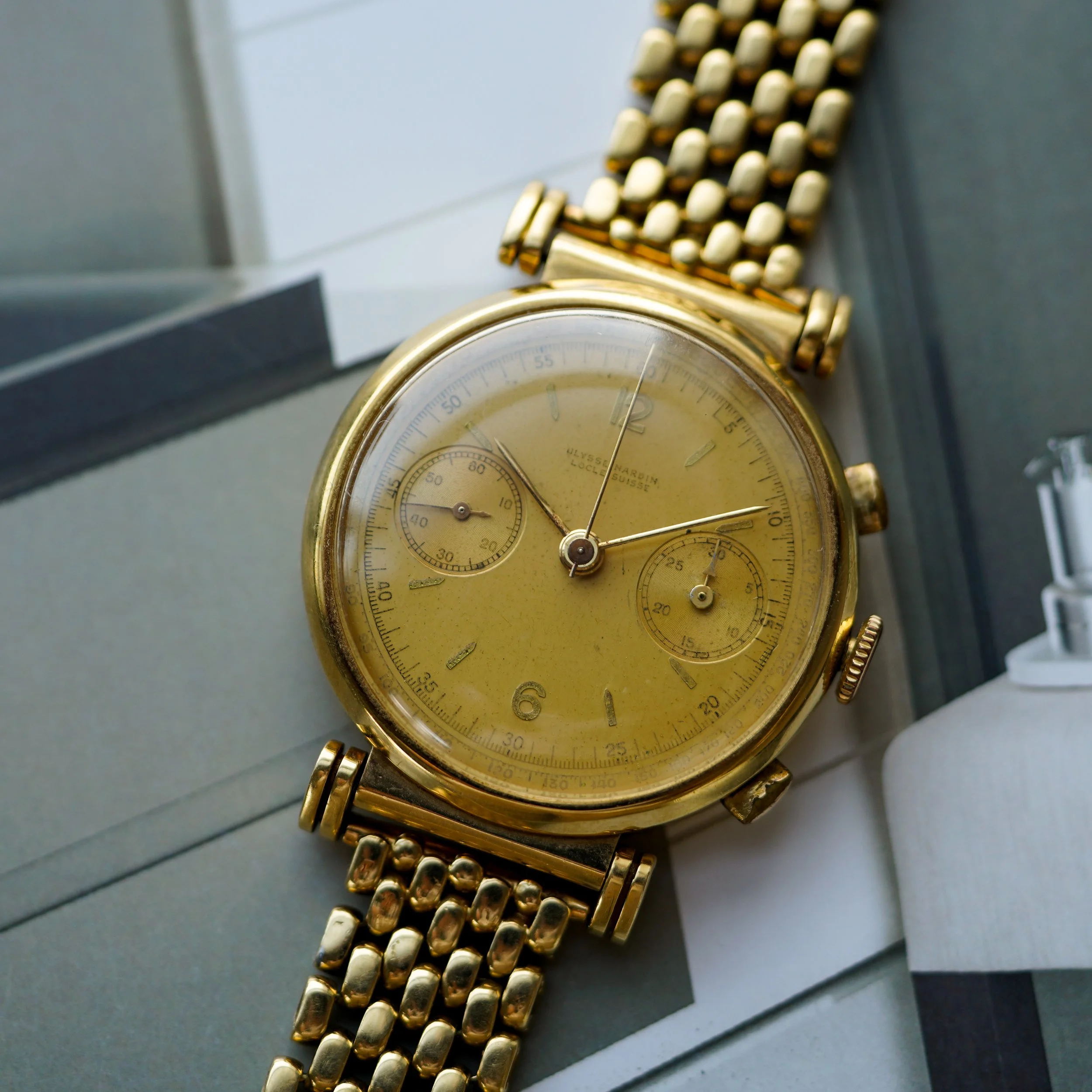 An exceedingly rare oversized chronograph in 18k gold from Ulysse Nardin, featuring a yellow dial with articulated lugs.