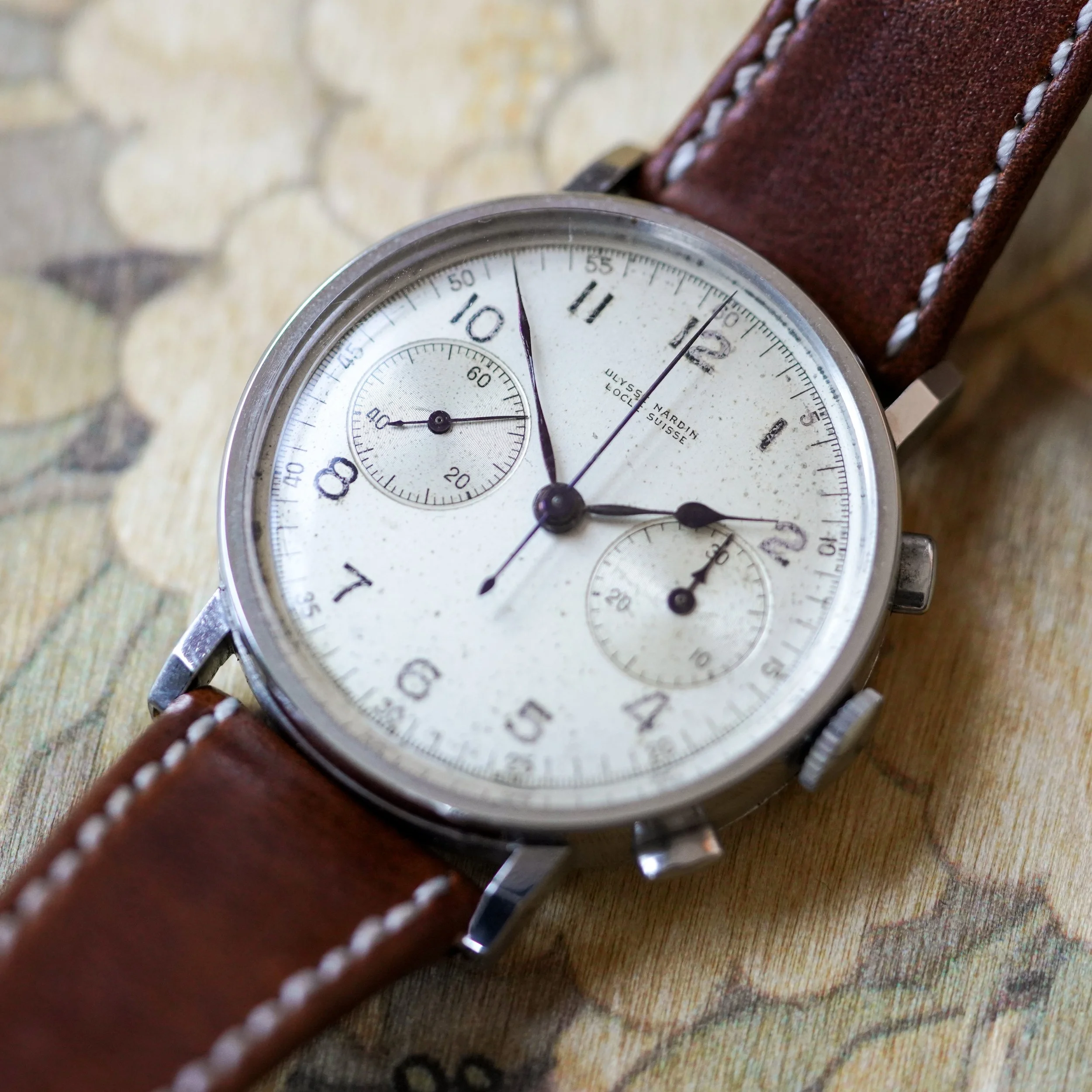 An extremely rare pilot-style chronograph from Ulysse Nardin, featuring unique purple spade hands.